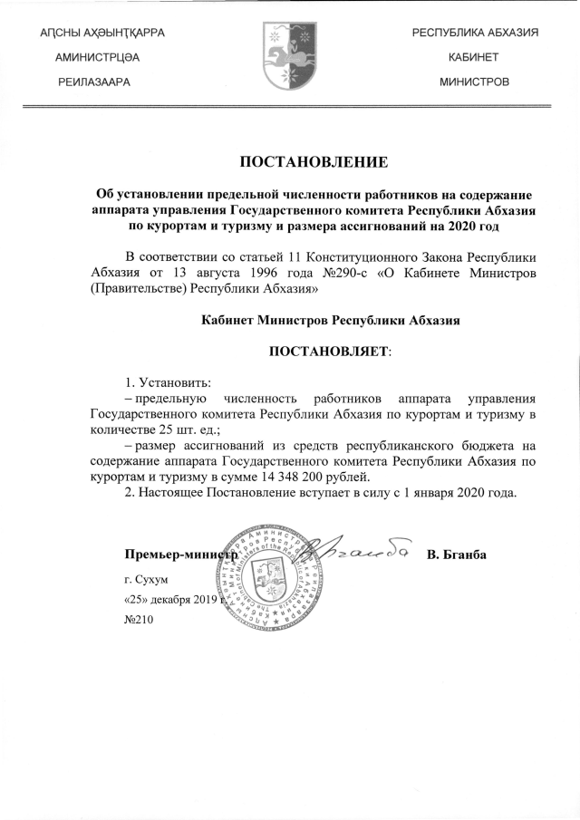 Постановление Кабинета Министров Республики Абхазия от 25.12.2019 №210 "Об установлении предельной численности работников на содержание аппарата управления Государственного комитета Республики Абхазия по курортам и туризму и размера ассигнований на 2020 год"