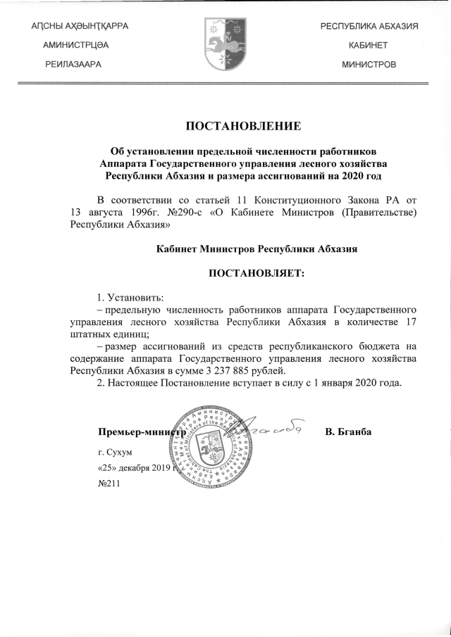 Постановление Кабинета Министров Республики Абхазия от 25.12.2019 №211 "Об установлении предельной численности работников Аппарата Государственного управления лесного хозяйства Республики Абхазия и размера ассигнований на 2020 год"
