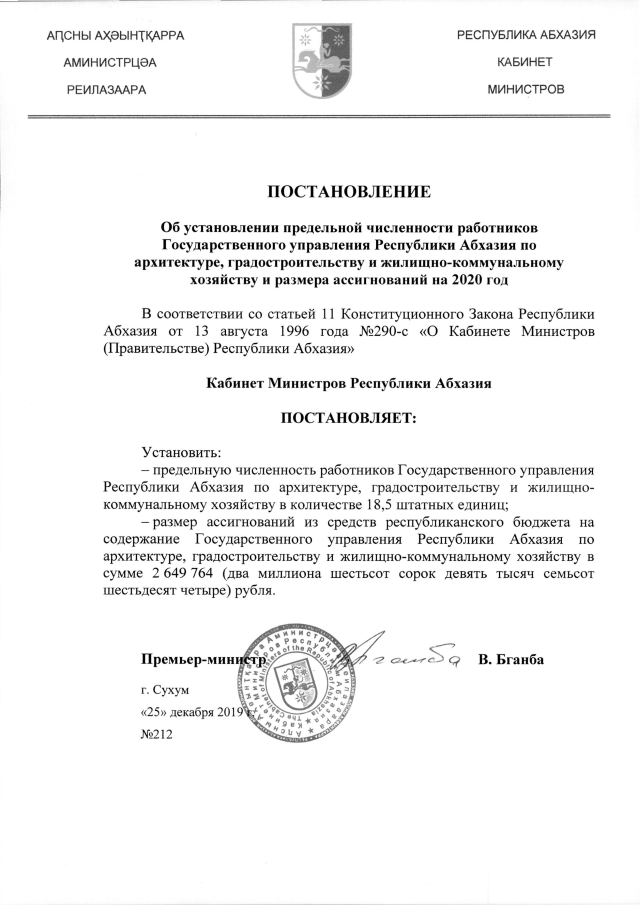 Постановление Кабинета Министров Республики Абхазия от 25.12.2019 №212 "Об установлении предельной численности работников Государственного управления Республики Абхазия по архитектуре, градостроительству и жилищно-коммунальному хозяйству и размера ассигнований на 2020 год"