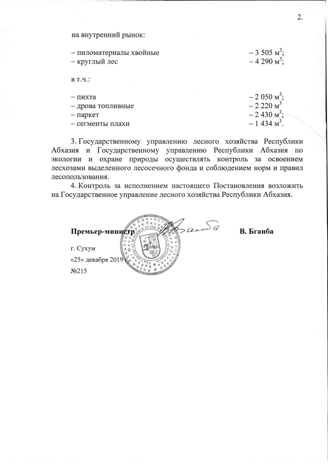 Постановление Кабинета Министров Республики Абхазия от 25.12.2019 №215 "Об утверждении лесосечного фонда и лесовосстановительных работ в лесах Республики Абхазия на 2020 год"