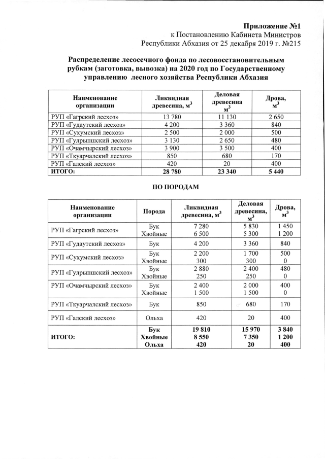 Постановление Кабинета Министров Республики Абхазия от 25.12.2019 №215 "Об утверждении лесосечного фонда и лесовосстановительных работ в лесах Республики Абхазия на 2020 год"