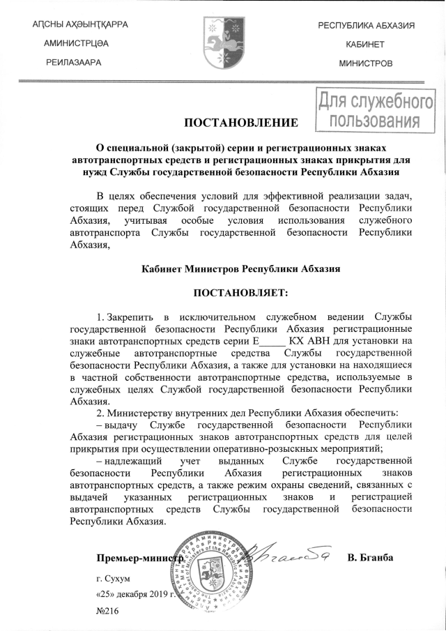 Постановление Кабинета Министров Республики Абхазия от 25.12.2019 №216 "О специальной (закрытой) серии и регистрационных знаках автотранспортных средств и регистрационных знаках прикрытия для нужд Службы государственной безопасности Республики Абхазия"