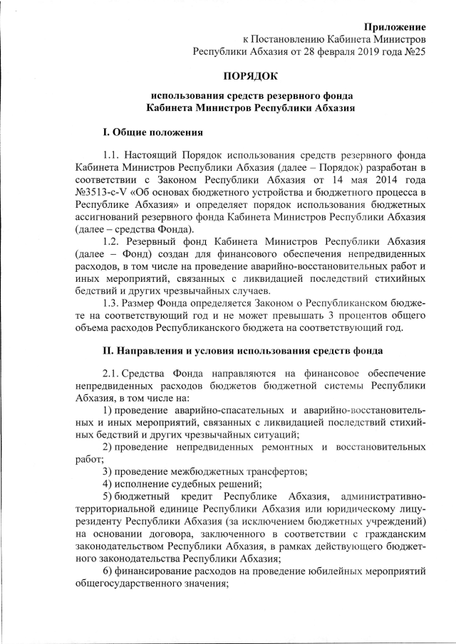Постановление Кабинета Министров Республики Абхазия от 28.02.2019 №25 "О порядке использования средств резервного фонда Кабинета Министров Республики Абхазия"