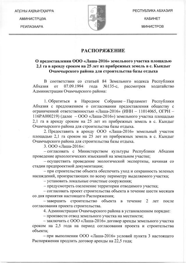 РАСПОРЯЖЕНИЕ Кабинета Министров Республики Абхазия от 05.08.2021 №59 "О предоставлении ООО "Лаша-2016" земельного участка площадью 2,1 га в аренду сроком на 25 лет из прибрежных земель в с. Кындыг Очамчырского района для строительства базы отдыха"