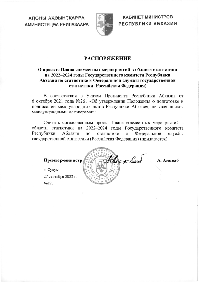 РАСПОРЯЖЕНИЕ Кабинета Министров Республики Абхазия от 27.09.2022 №127 "О проекте Плана совместных мероприятий в области статистики на 2022-2024 годы Государственного комитета Республики Абхазия по статистике и Федеральной службы государственной статистики (Российская Федерация)"