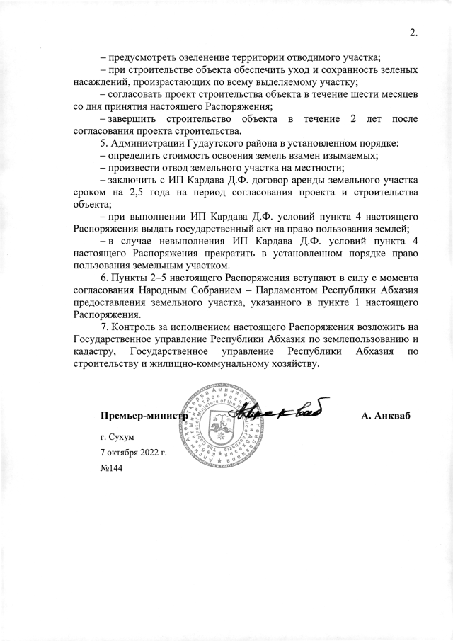 РАСПОРЯЖЕНИЕ Кабинета Министров Республики Абхазия от 07.10.2022 №144 "О переводе земельного участка площадью 0,38 га в с. Хыпста из категории "земли сельскохозяйственного назначения" в категорию "земли населенных пунктов" и даче согласия Администрации Гудаутского района на предоставление земельного участка площадью 0,48 га индивидуальному предпринимателю Кардава Д. Ф. для строительства средства размещения гостиничного типа (гостиницы)"