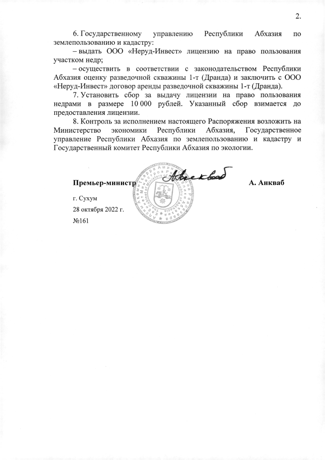 РАСПОРЯЖЕНИЕ Кабинета Министров Республики Абхазия от 28.10.2022 №161 "О предоставлении ООО "Неруд-Инвест" разрешения на проведение поиска и расконсервации скважины высокотермальных подземных вод в целях последующего предоставления права пользования участком недр для добычи высокотермальных подземных вод в с. Бабышира Гулрыпшского района"