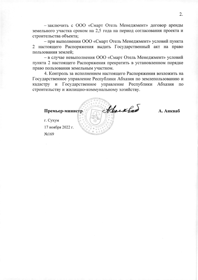 РАСПОРЯЖЕНИЕ Кабинета Министров Республики Абхазия от 17.11.2022 №169 "О даче согласия Администрации Гагрского района на предоставление обществу с ограниченной ответственностью "Смарт Отель Менеджмент" в постоянное пользование земельного участка площадью 0,29 га в г. Гагра для строительства средства размещения гостиничного типа"