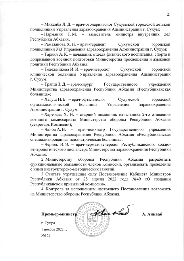 ПОСТАНОВЛЕНИЕ Кабинета Министров Республики Абхазия от 01.11.2022 №124 "О создании Республиканской призывной комиссии"