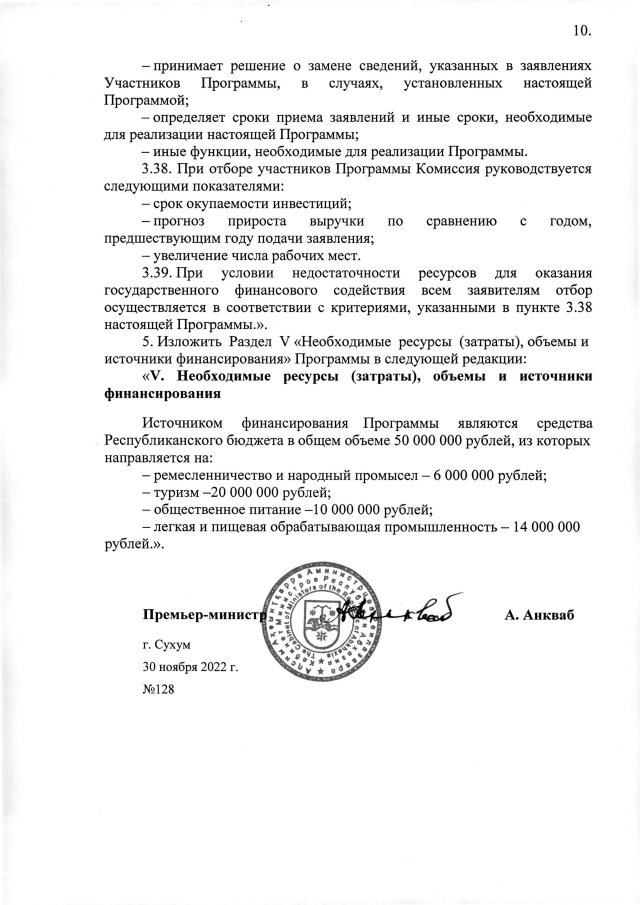 Постановление Кабинета Министров Республики Абхазия от 30.11.2022 №128 "О внесении изменений в ведомственную краткосрочную целевую Программу "Поддержка малого и среднего предпринимательства в Республике Абхазия на 2022 год", утвержденную Постановлением Кабинета Министров Республики Абхазия от 28 июля 2022 года №86"