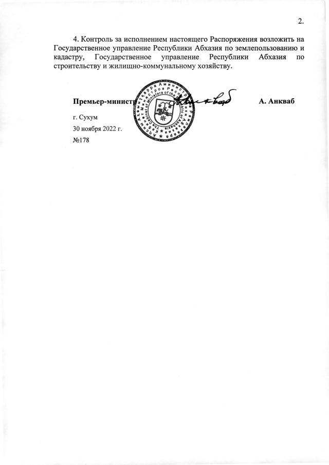 РАСПОРЯЖЕНИЕ Кабинета Министров Республики Абхазия от 30.11.2022 №178 "О даче согласия Администрации Гулрыпшского района на предоставление в постоянное пользование земельного участка индивидуальному предпринимателю Шакая Г. Г. площадью 0,06 г в с. Мачара для строительства автомойки"