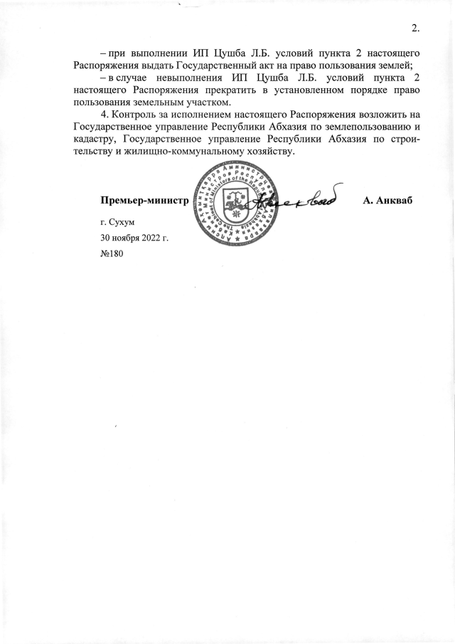 РАСПОРЯЖЕНИЕ Кабинета Министров Республики Абхазия от 30.11.2022 №180 "О даче согласии Администрации Гудаутского района на предоставление индивидуальному предпринимателю Цушба Л.Б. в постоянное пользование 0,09 га земли в селе Лыхны для строительства средства размещения гостиничного типа (гостиницы)"