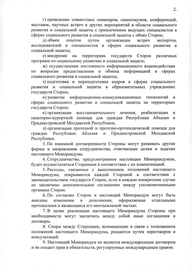 РАСПОРЯЖЕНИЕ Кабинета Министров Республики Абхазия от 30.11.2022 №172 "О проекте Меморандума между Министерством здравоохранения Республики Абхазия, Министерством социального обеспечения и демографической политики Республики Абхазия и Министерством здравоохранения Приднестровской Молдавской Республики, Министерством по социальной защите и труду Приднестровской Молдавской Республики о сотрудничестве в сфере здравоохранения, социального развития и социальной защиты"