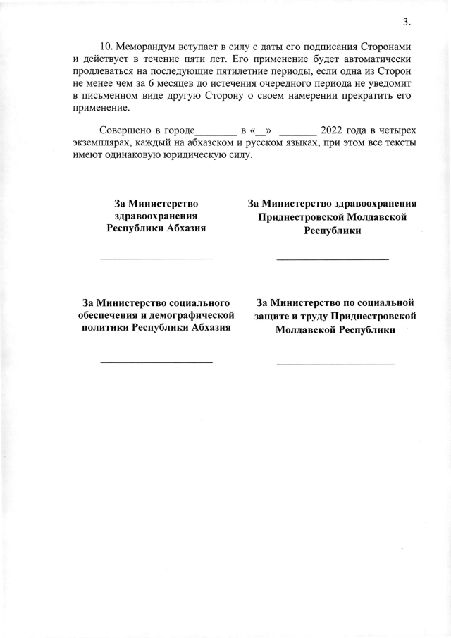 РАСПОРЯЖЕНИЕ Кабинета Министров Республики Абхазия от 30.11.2022 №172 "О проекте Меморандума между Министерством здравоохранения Республики Абхазия, Министерством социального обеспечения и демографической политики Республики Абхазия и Министерством здравоохранения Приднестровской Молдавской Республики, Министерством по социальной защите и труду Приднестровской Молдавской Республики о сотрудничестве в сфере здравоохранения, социального развития и социальной защиты"