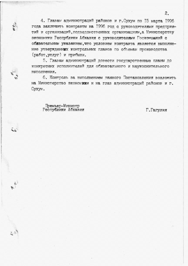 Постановление Кабинета Министров Республики Абхазия от 15.02.1996 № 1 "О плане экономического и социального развития Республики Абхазия на 1996 год и об утверждении контрольных планов городам (районам), госкомпаниям, промышленным и сельскохозяйственным предприятиям"