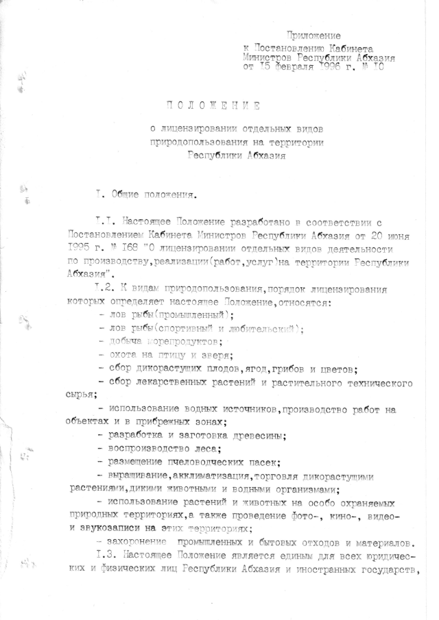 Постановление Кабинета Министров Республики Абхазия от 15.02.1996 № 10 "Об утверждении "Положения о лицензировании отдельных видов природопользования на территории Республики Абхазия"
