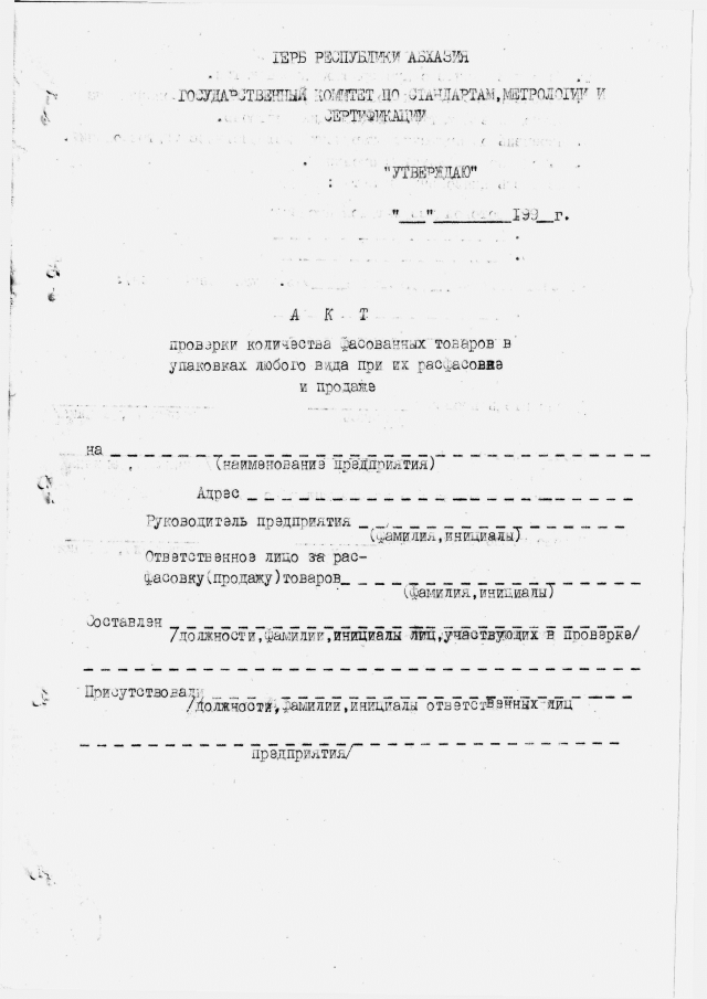 Постановление Кабинета Министров Республики Абхазия от 15.02.1996 № 12 "Об утверждении "Порядка осуществления государственного метрологического надзора за количеством фасованных товаров в упаковках любого вида при их расфасовке и продаже"
