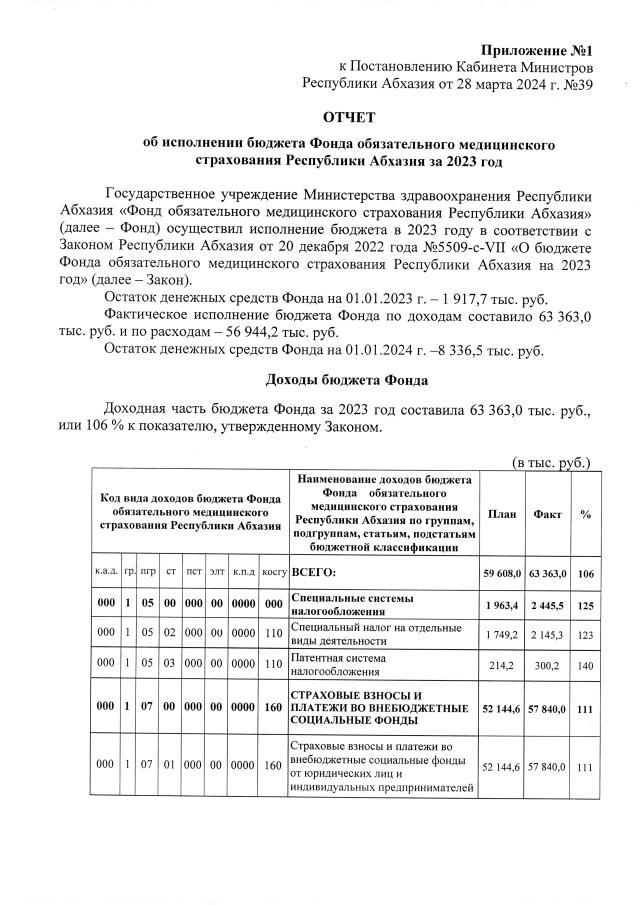 Постановление Кабинета Министров Республики Абхазия от 28.03.2024 №39 "Об исполнении бюджета Фонда обязательного медицинского страхования Республики Абхазия за 2023 год"