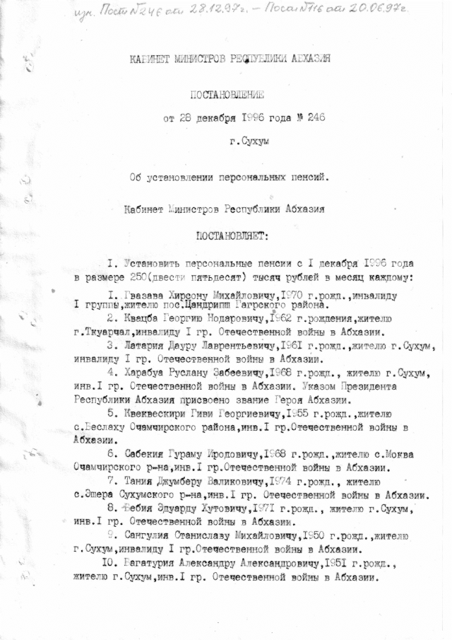 Постановление Кабинета Министров Республики Абхазия от 28.12.1996 № 246 "Об установлении персональных пенсий"