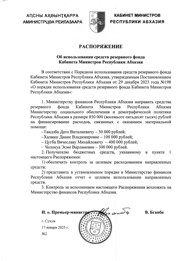 РАСПОРЯЖЕНИЕ Кабинета Министров Республики Абхазия от 17.01.2025 №2 "Об использовании средств резервного фонда Кабинета Министров Республики Абхазия"