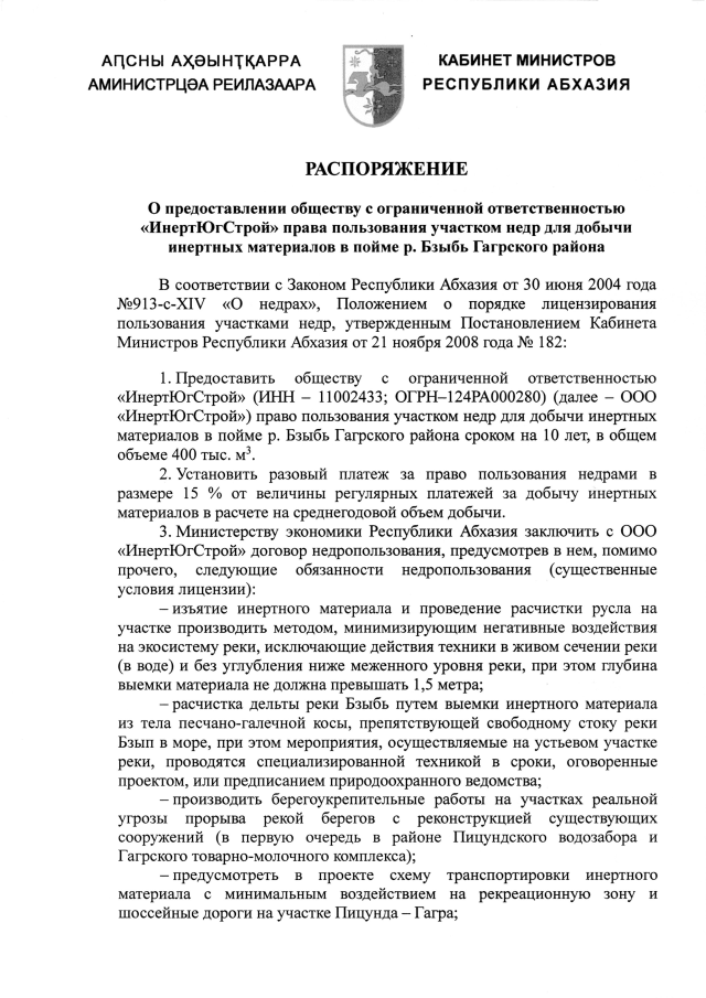 РАСПОРЯЖЕНИЕ Кабинета Министров Республики Абхазия от 24.01.2025 №7 "О предоставлении обществу с ограниченной ответственностью <ИнертЮгСтрой> права пользования участком недр для добычи инертных материалов в пойме р. Бзыбь Гагрского района"