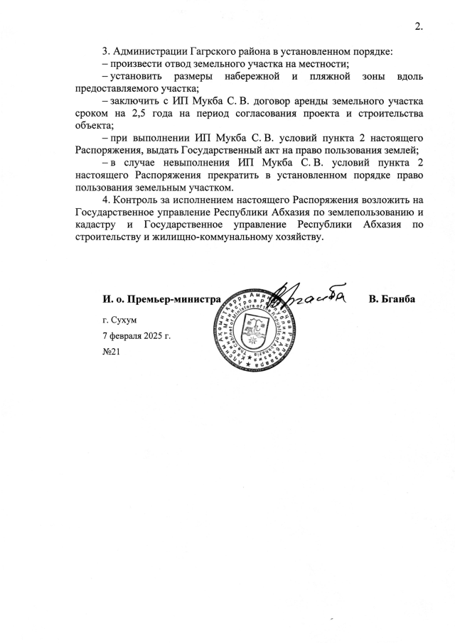 РАСПОРЯЖЕНИЕ Кабинета Министров Республики Абхазия от 7.02.2025 №21 "О даче согласия Администрации Гагрского района на предоставление в постоянное пользование индивидуальному предпринимателю Мукба С. В. земельного участка площадью 0,21 га в г. Гагра, в районе микрорайона <Кемпинг> для строительства средства размещения гостиничного типа"