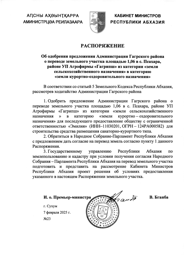 РАСПОРЯЖЕНИЕ Кабинета Министров Республики Абхазия от 7.02.2025 №23 "Об одобрении предложения Администрации Гагрского района о переводе земельного участка площадью 1,06 в с. Псахара, районе УП Агрофирмы <Гагрипш> из категории <земли сельскохозяйственного назначения> в категорию <земли курортно-оздоровительного назначения>"