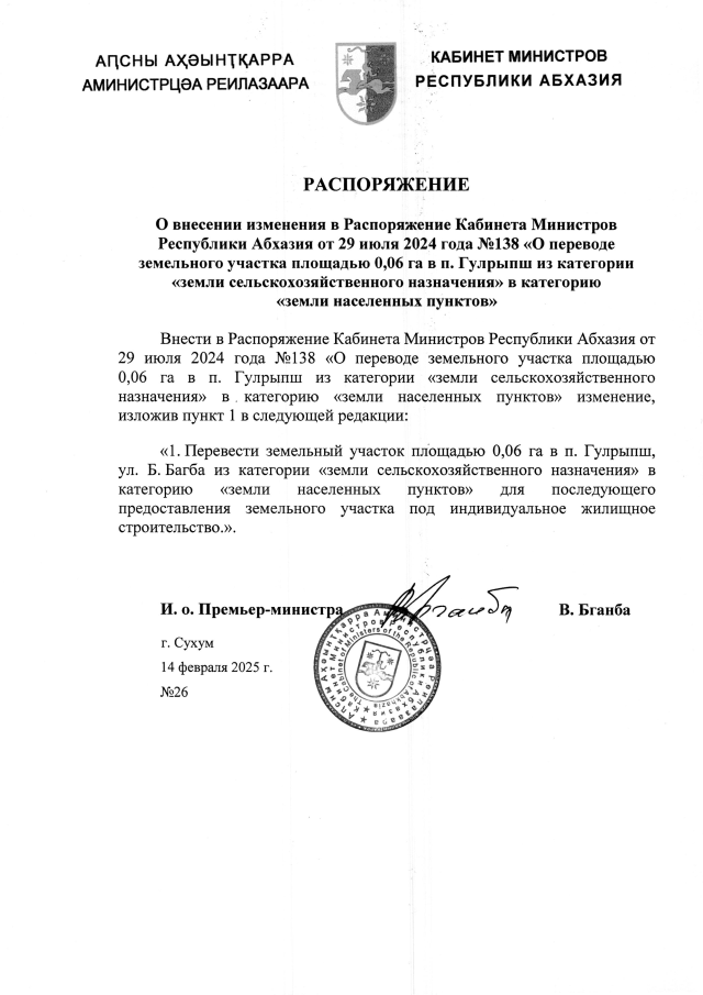 РАСПОРЯЖЕНИЕ Кабинета Министров Республики Абхазия от 14.02.2025 №26 "О внесении изменения в Распоряжение Кабинета Министров Республики Абхазия от 29 июля 2024 года №138 <О переводе земельного участка площадью 0,06 га в п. Гулрыпш из категории <земли сельскохозяйственного назначения> в категорию <земли населенных пунктов>"