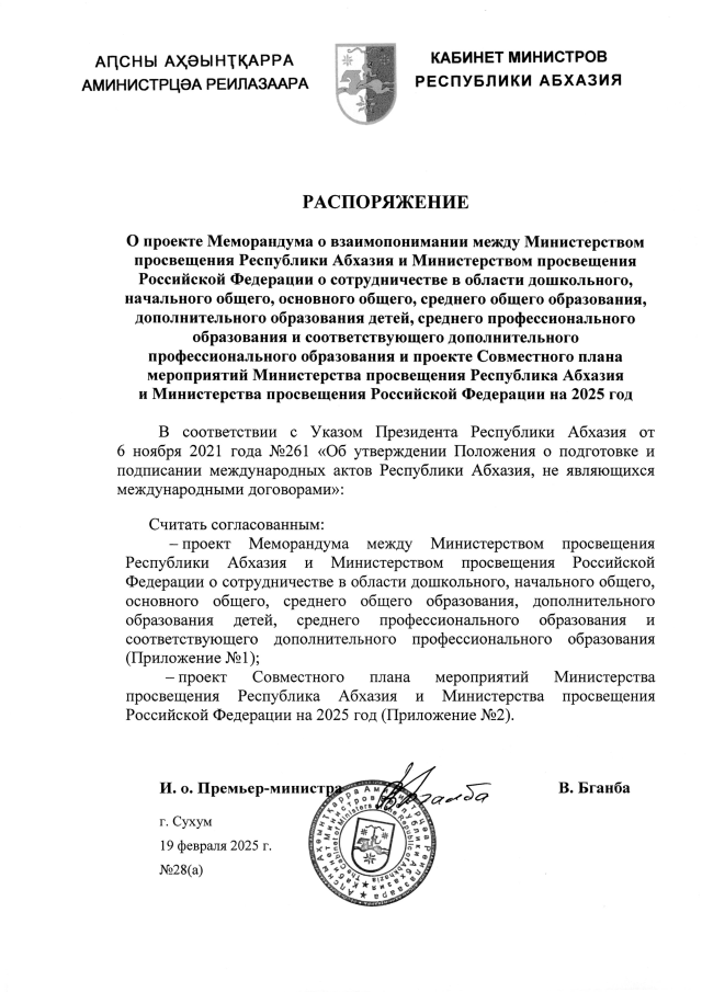 РАСПОРЯЖЕНИЕ Кабинета Министров Республики Абхазия от 19.02.2025 №28а "О проекте Меморандума о взаимопонимании между Министерством просвещения Республики Абхазия и Министерством просвещения Российской Федерации о сотрудничестве в области дошкольного, начального общего, основного общего, среднего общего образования, дополнительного образования детей, среднего профессионального образования и соответствующего дополнительного профессионального образования и проекте Совместного плана мероприятий Министерства просвещения Республика Абхазия и Министерства просвещения Российской Федерации на 2025 год"