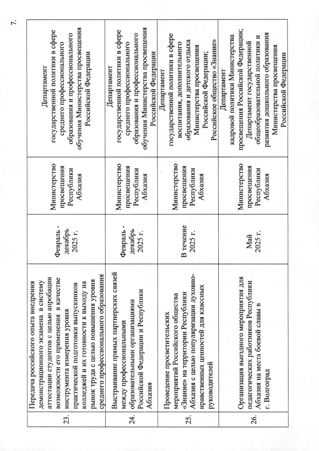 РАСПОРЯЖЕНИЕ Кабинета Министров Республики Абхазия от 19.02.2025 №28а "О проекте Меморандума о взаимопонимании между Министерством просвещения Республики Абхазия и Министерством просвещения Российской Федерации о сотрудничестве в области дошкольного, начального общего, основного общего, среднего общего образования, дополнительного образования детей, среднего профессионального образования и соответствующего дополнительного профессионального образования и проекте Совместного плана мероприятий Министерства просвещения Республика Абхазия и Министерства просвещения Российской Федерации на 2025 год"