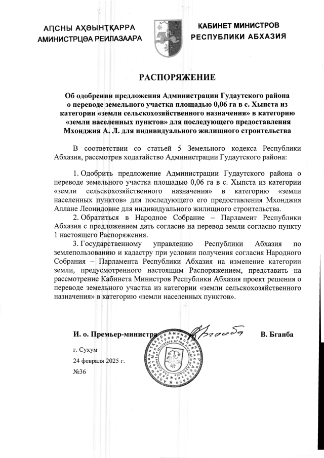 РАСПОРЯЖЕНИЕ Кабинета Министров Республики Абхазия от 24.02.2025 №36 "Об одобрении предложения Администрации Гудаутского района о переводе земельного участка площадью 0,06 га в с. Хыпста из категории <земли сельскохозяйственного назначения> в категорию <земли населенных пунктов> для последующего предоставления Мхонджия А. Л. для индивидуального жилищного строительства"