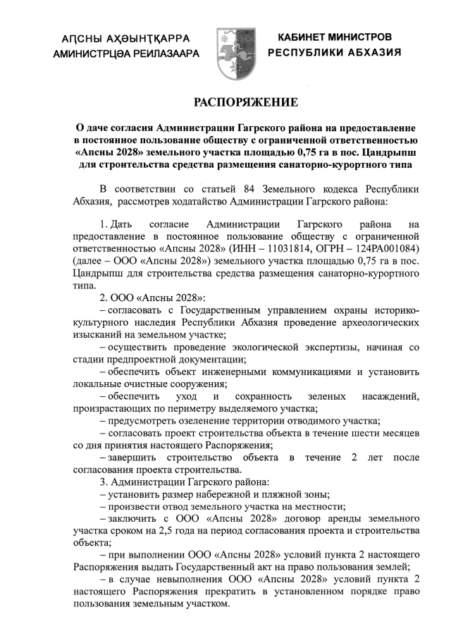 РАСПОРЯЖЕНИЕ Кабинета Министров Республики Абхазия от 27.02.2025 №44 "О даче согласия Администрации Гагрского района на предоставление в постоянное пользование обществу с ограниченной ответственностью <Апсны 2028> земельного участка площадью 0,75 га в пос. Цандрыпш для строительства средства размещения санаторно-курортного типа"