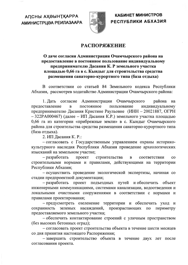РАСПОРЯЖЕНИЕ Кабинета Министров Республики Абхазия от 27.02.2025 №43 "О даче согласия Администрации Очамчырского района на предоставление в постоянное пользование индивидуальному предпринимателю Дасания К. Р земельного участка площадью 0,66 га в с. Кындыг для строительства средства размещения санаторно-курортного типа (база отдыха)"