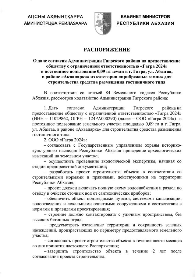 РАСПОРЯЖЕНИЕ Кабинета Министров Республики Абхазия от 27.02.2025 №41 "О даче согласия Администрации Гагрского района на предоставление обществу с ограниченной ответственностью <Гагра 2024> в постоянное пользование 0,09 га земли в г. Гагра, ул. Абазгаа,в районе <Аквапарка> из категории <прибрежные земли> для строительства средства размещения гостиничного типа"