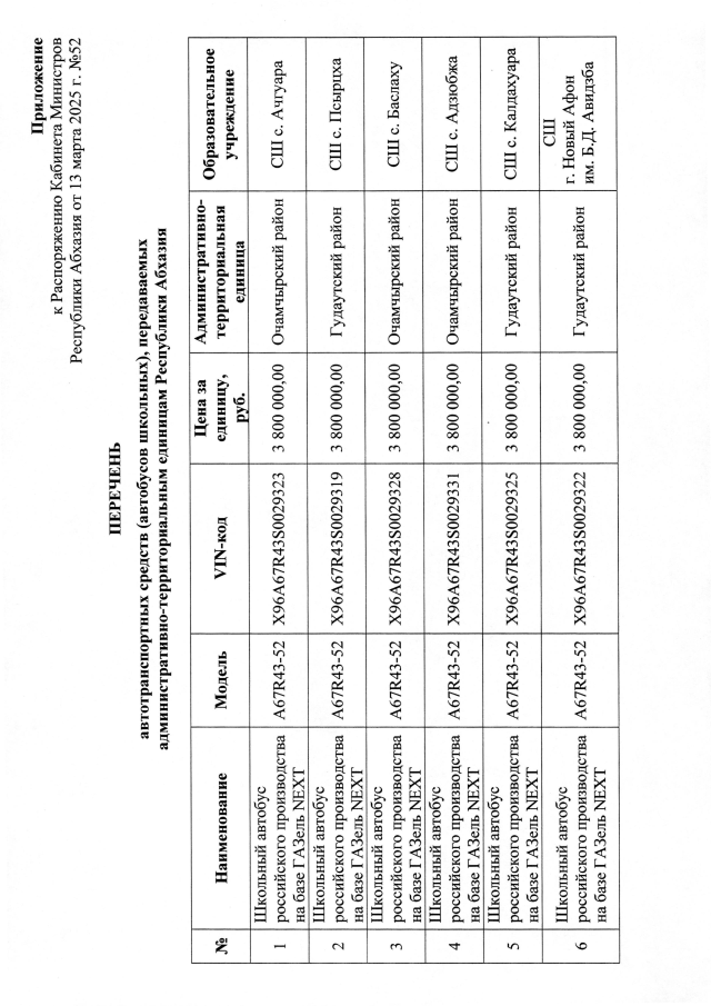 РАСПОРЯЖЕНИЕ Кабинета Министров Республики Абхазия от 13.03.2025 №52 "О передаче административно-территориальным единицам Республики Абхазия автотранспортных средств (автобусов школьных) и интерактивных досок, безвозмездно переданных образовательным учреждениям Республики Абхазия Краснодарским региональным отделением Общероссийского общественного движения <Россия Молодая>"