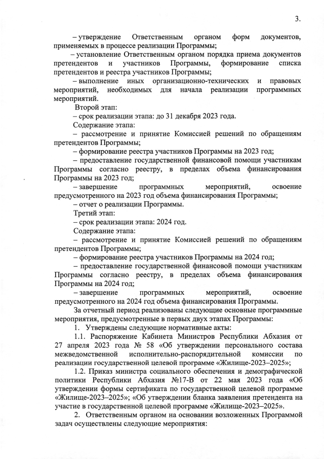 РАСПОРЯЖЕНИЕ Кабинета Министров Республики Абхазия от 14.03.2025 №54 "Отчет о выполнении программных мероприятий по государственной целевой программе <Жилище-2023 - 2025>, утвержденной Указом Президента Республики Абхазия от 29 декабря 2022 года № 373, предусмотренных к реализации в 2024 году"