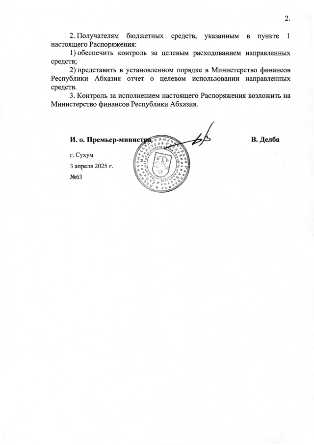 РАСПОРЯЖЕНИЕ Кабинета Министров Республики Абхазия от 03.04.2025 №63 "Об использовании средств резервного фонда Кабинета Министров Республики Абхазия"