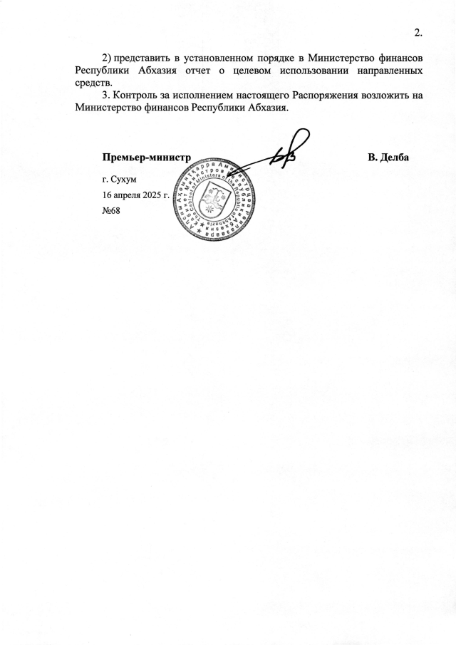 РАСПОРЯЖЕНИЕ Кабинета Министров Республики Абхазия от 16.04.2025 №68 "Об использовании средств резервного фонда Кабинета Министров Республики Абхазия"