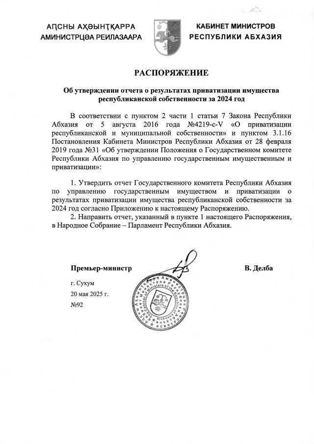 РАСПОРЯЖЕНИЕ Кабинета Министров Республики Абхазия от 20.05.2025 №92 "Об утверждении отчета о результатах приватизации имущества республиканской собственности за 2024 год"
