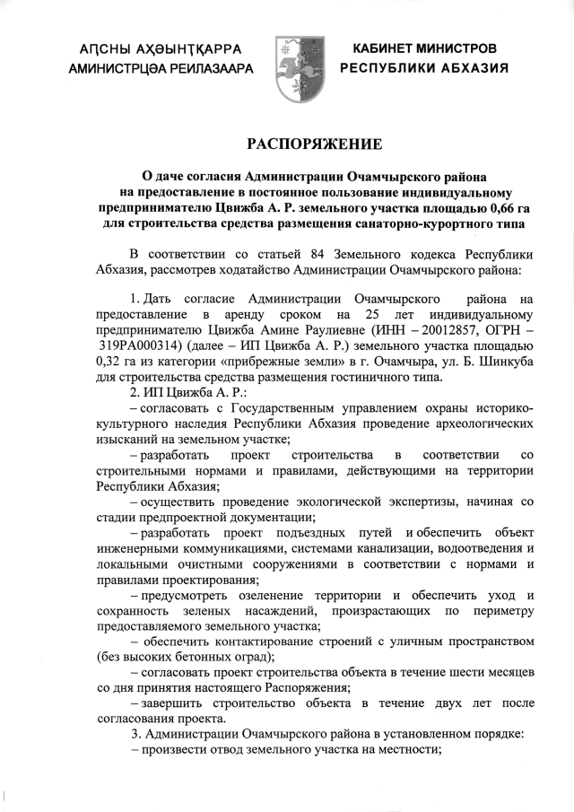 РАСПОРЯЖЕНИЕ Кабинета Министров Республики Абхазия от 21.05.2025 №101 "О даче согласия Администрации Очамчырского района на предоставление в постоянное пользование индивидуальному предпринимателю Цвижба А. Р. земельного участка площадью 0,66 га для строительства средства размещения санаторно-курортного типа"