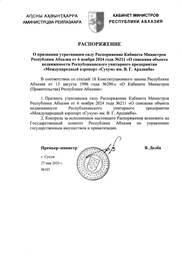 РАСПОРЯЖЕНИЕ Кабинета Министров Республики Абхазия от 27.05.2025 №103 "О признании утратившим силу Распоряжение Кабинета Министров Республики Абхазия от 6 ноября 2024 года №211 <О списании объекта недвижимости Республиканского унитарного предприятия <Международный аэропорт <Сухум> им. В. Г. Ардзинба>"
