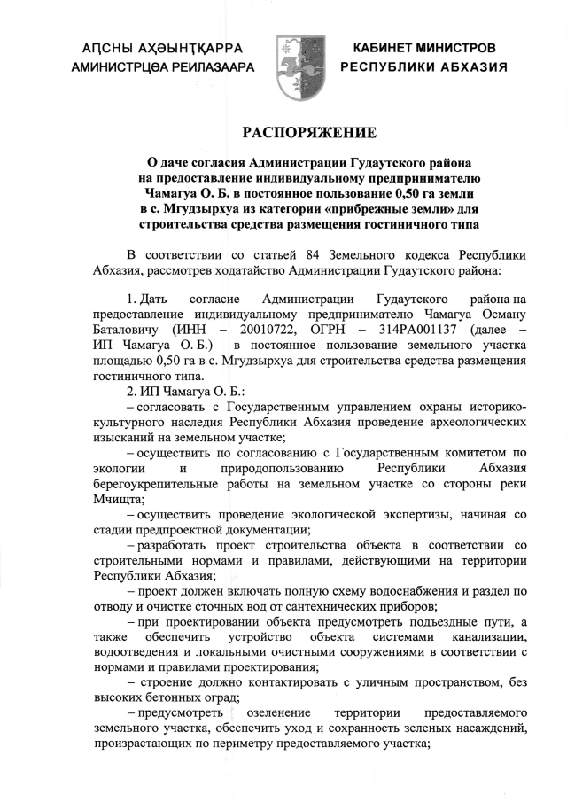РАСПОРЯЖЕНИЕ Кабинета Министров Республики Абхазия от 29.05.2025 №110 "О даче согласия Администрации Гудаутского района на предоставление индивидуальному предпринимателю Чамагуа О. Б. в постоянное пользование 0,50 га земли в с. Мгудзырхуа из категории <прибрежные земли> для строительства средства размещения гостиничного типа"