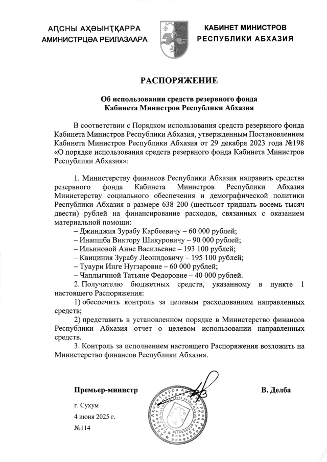 РАСПОРЯЖЕНИЕ Кабинета Министров Республики Абхазия от 04.06.2025 №114 "Об использовании средств резервного фонда Кабинета Министров Республики Абхазия"