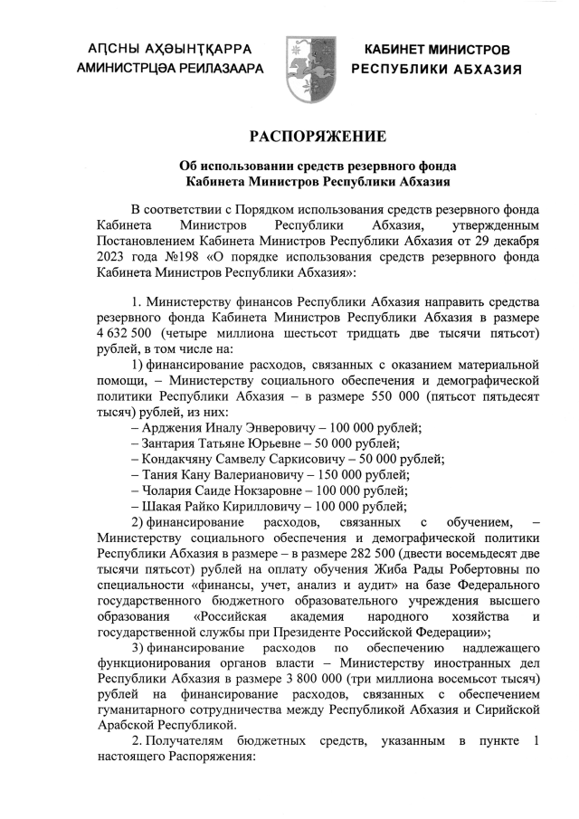 РАСПОРЯЖЕНИЕ Кабинета Министров Республики Абхазия от 09.06.2025 №117 "Об использовании средств резервного фонда Кабинета Министров Республики Абхазия"