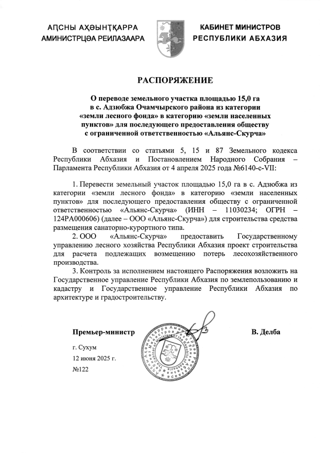 РАСПОРЯЖЕНИЕ Кабинета Министров Республики Абхазия от 12.06.2025 №122 "О переводе земельного участка площадью 15,0 га в с. Адзюбжа Очамчырского района из категории <земли лесного фонда> в категорию <земли населенных пунктов> для последующего предоставления обществу с ограниченной ответственностью <Альянс-Скурча>"
