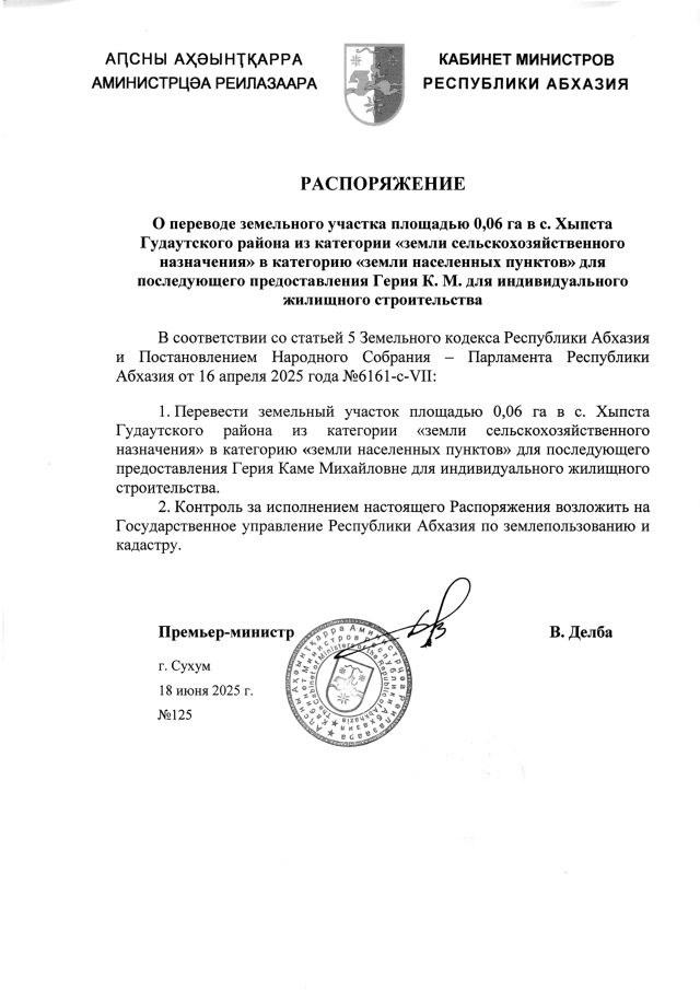 РАСПОРЯЖЕНИЕ Кабинета Министров Республики Абхазия от 18.06.2025 №125 "О переводе земельного участка площадью 0,06 га в с. Хыпста Гудаутского района из категории <земли сельскохозяйственного назначения> в категорию <земли населенных пунктов> для последующего предоставления Герия К. М. для индивидуального жилищного строительства"