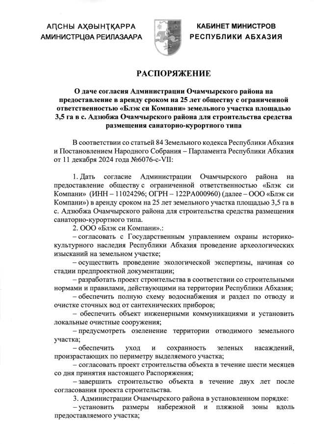 РАСПОРЯЖЕНИЕ Кабинета Министров Республики Абхазия от 25.06.2025 №135 "О даче согласия Администрации Очамчырского района на предоставление в аренду сроком на 25 лет обществу с ограниченной ответственностью <Блэк си Компани> земельного участка площадью 3,5 га в с. Адзюбжа Очамчырского района для строительства средства размещения санаторно-курортного типа"