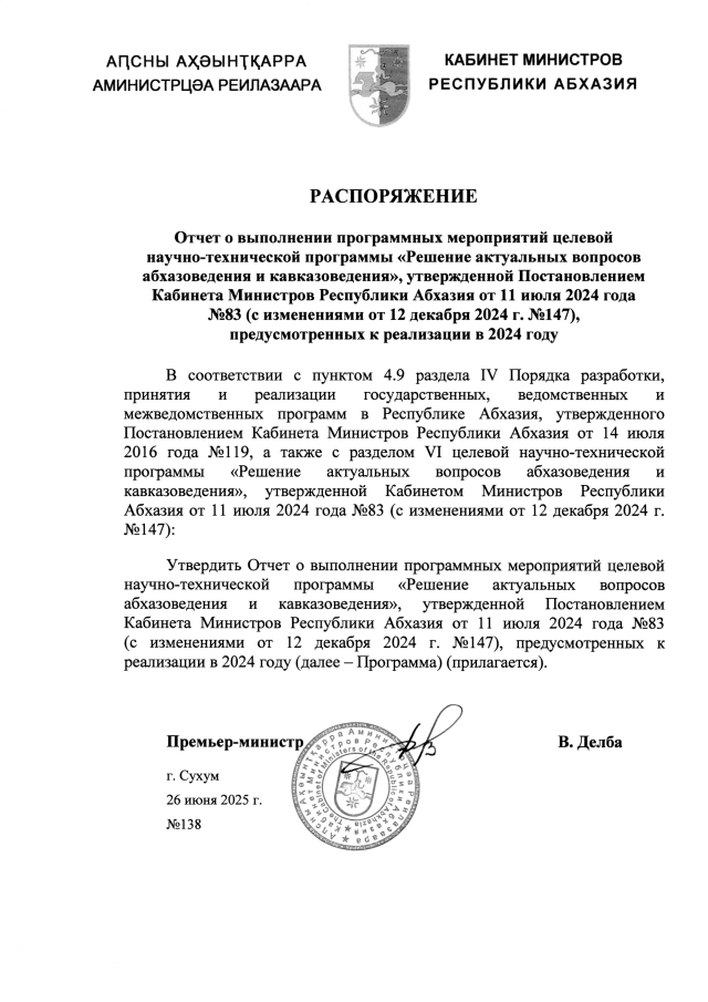 РАСПОРЯЖЕНИЕ Кабинета Министров Республики Абхазия от 26.06.2025 №138 "Отчет о выполнении программных мероприятий целевой научно-технической программы <Решение актуальных вопросов абхазоведения и кавказоведения>, утвержденной Постановлением Кабинета Министров Республики Абхазия от 11 июля 2024 года №83 (с изменениями от 12 декабря 2024 г. №147),предусмотренных к реализации в 2024 году"