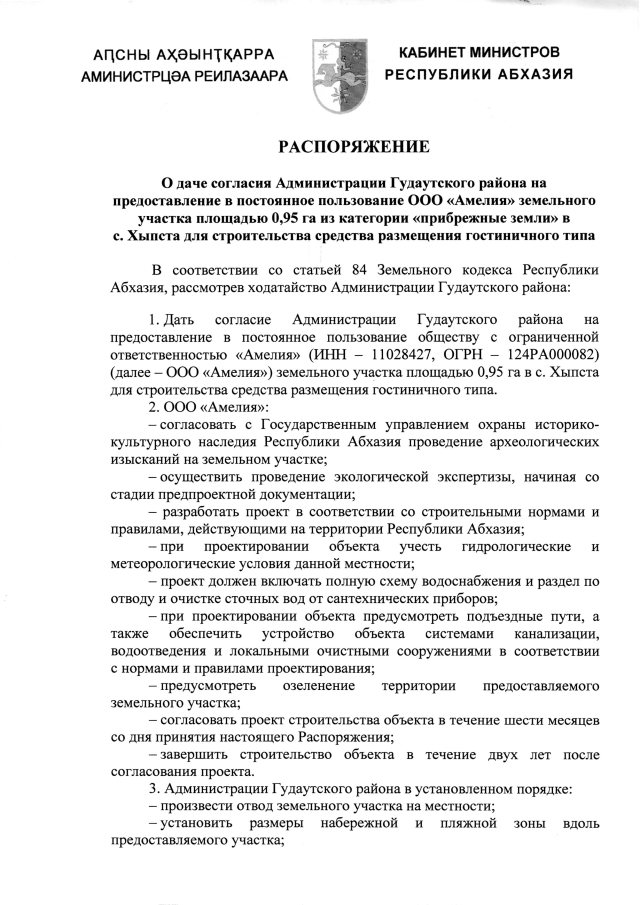 РАСПОРЯЖЕНИЕ Кабинета Министров Республики Абхазия от 03.07.2025 №148 "О даче согласия Администрации Гудаутского района на предоставление в постоянное пользование ООО <Амелия> земельного участка площадью 0,95 га из категории <прибрежные земли> в с. Хыпста для строительства средства размещения гостиничного типа"