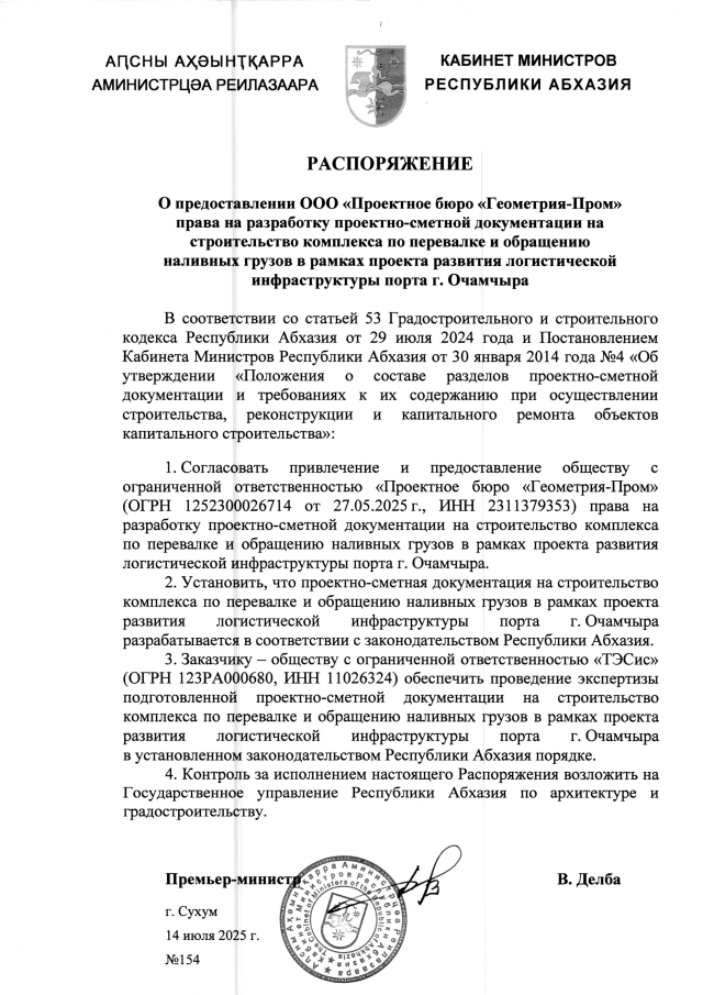 РАСПОРЯЖЕНИЕ Кабинета Министров Республики Абхазия от 14.07.2025 №154 "О предоставлении ООО <Проектное бюро <Геометрия-Пром> права на разработку проектно-сметной документации на строительство комплекса по перевалке и обращению наливных грузов в рамках проекта развития логистической инфраструктуры порта г. Очамчыра"